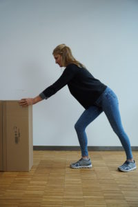 Übungstipp: Hebe mehrmals einen Getränkekasten hoch und kontrolliere dich selber (z. B. in einem Spiegel) während du übst. Pass dabei auf einen sicheren Stand und einen geraden Rücken auf. Denke daran, in die Hocke zu gehen und mithilfe deiner Beine zu heben. Du kannst erstmal von einer Erhöhung mit einem leeren Kasten üben, danach mit einem vollen. Wenn du dich dann sicher fühlst, kannst du auch vom Boden aus starten